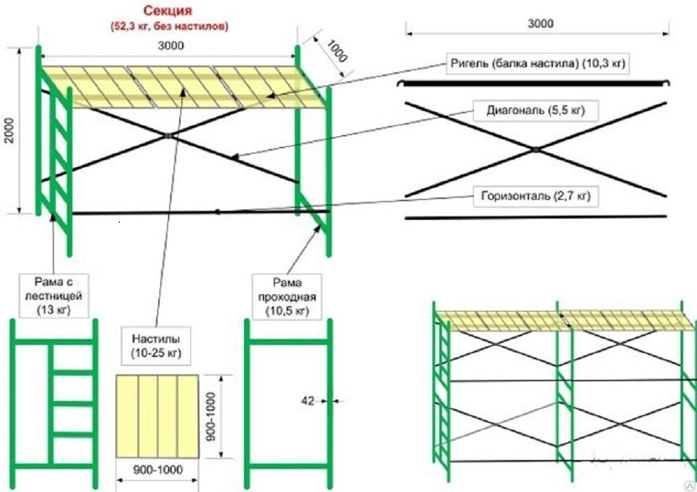 Как правило, их используют в случаях, когда необходимо выполнить работы на высоте, где использование лестницы- стремянки небезопасно или необходимо разместить строительные материалы и инструмент в зоне выполняемых работ